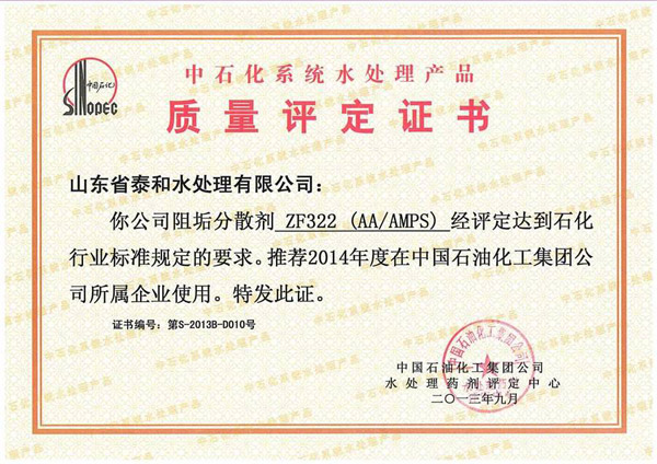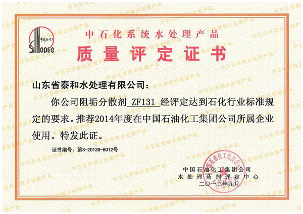 中石化系統(tǒng)水處理產(chǎn)品質(zhì)量評(píng)定證書